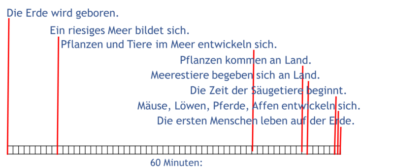 Das ist rund viereinhalb Milliarden Jahre her. Diese Zahl schreibt man so: 4.500.000.000! Aber unter einer Zahl mit so vielen Nullen kann sich kaum jemand etwas vorstellen. Um diese lange Zeitspanne besser zu überblicken, denken wir uns deshalb, die Erde wäre erst vor 60 Minuten entstanden.