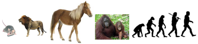 Quallen, Muscheln, Seeigel, Fische --- Stachelhalme, Farne --- Lurche, Saurier, Vögel ---- Mäuse, Löwe, Pferde, Affen --- Menschen