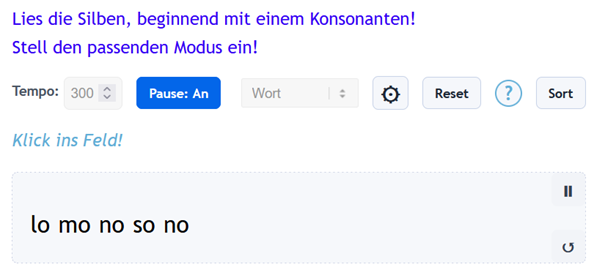 Bei vielen Schülern hat es geholfen, die Silben buchstabenweise am Bildschirm anzuzeigen, so, dass der Schüler sieht, mit welchem Laut es losgeht. Im Feld Tempo oben links gibt man die Verzögerung für den nächsten Laut an. Je höher die Zahl, desto langsamer ist die Anzeige.