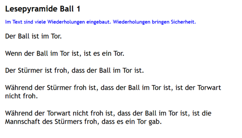 Nach dem Test wird entschieden, wie geübt wird. Ich suche eine passende Übung für den Anfang heraus. Hier war es eine einfache Lesepyramide.