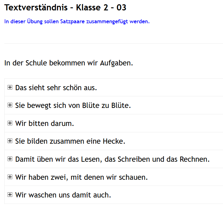 Textverständnisübungen, um diese Fertigkeit schon relativ früh zu entwickeln und zu testen. Ordner: Am Anfang – Textverständnis und später Klasse 2 – Textverständnis – und Klasse 3 – Textverständnis