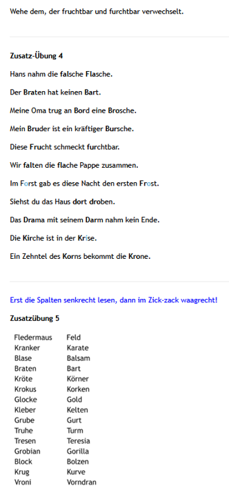 Verschiedene Texte mit Wiederholungs- und Verständnisübungen: Ordner: Am Anfang – Texte – Einfache Leseübung und Tierquatsch sowie Texte aus den Ordner Klasse 2 und 3 sowie aus dem Ordner Symptome – Blick von rechts, auch online